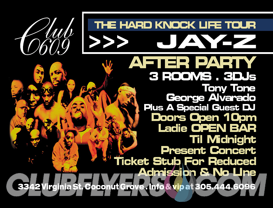Home Club Club flyer for Jay Z’s Hard Knock Life Tour Afterparty, Club 609,... Club Club flyer for Jay Z’s Hard Knock Life Tour Afterparty, Club 609, Miami, FL By Katherine Manning - July 31, 2019 Look at this classic club flyer for Jay-Z’s Hard Knock Life Tour Afterparty, Club 609, Miami, FL in 1999.